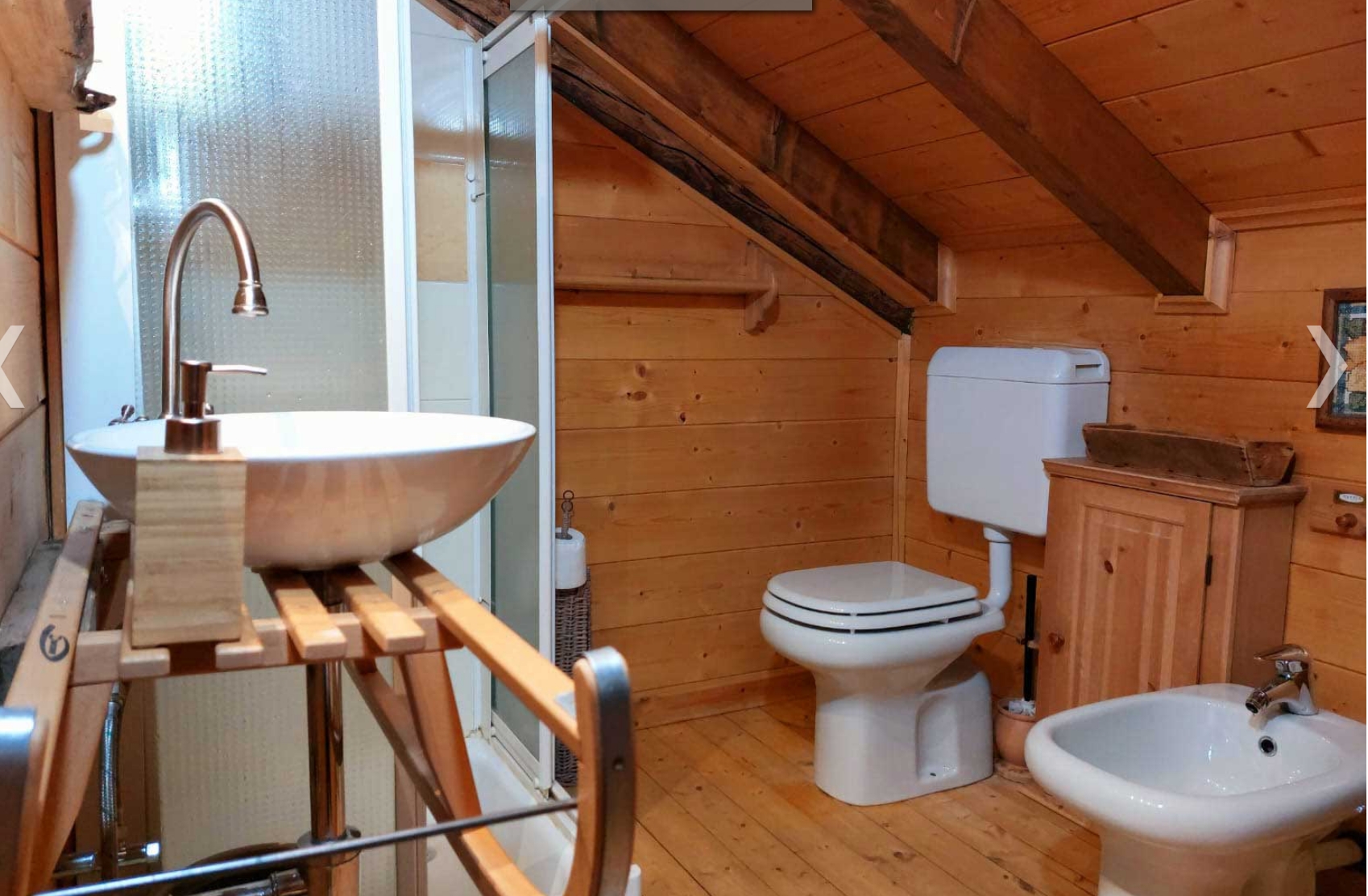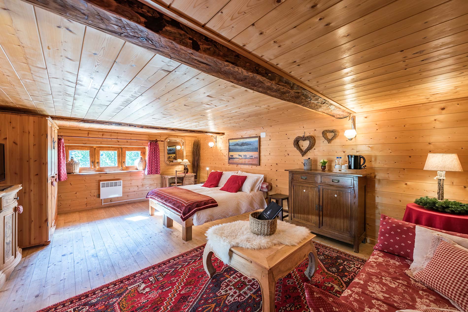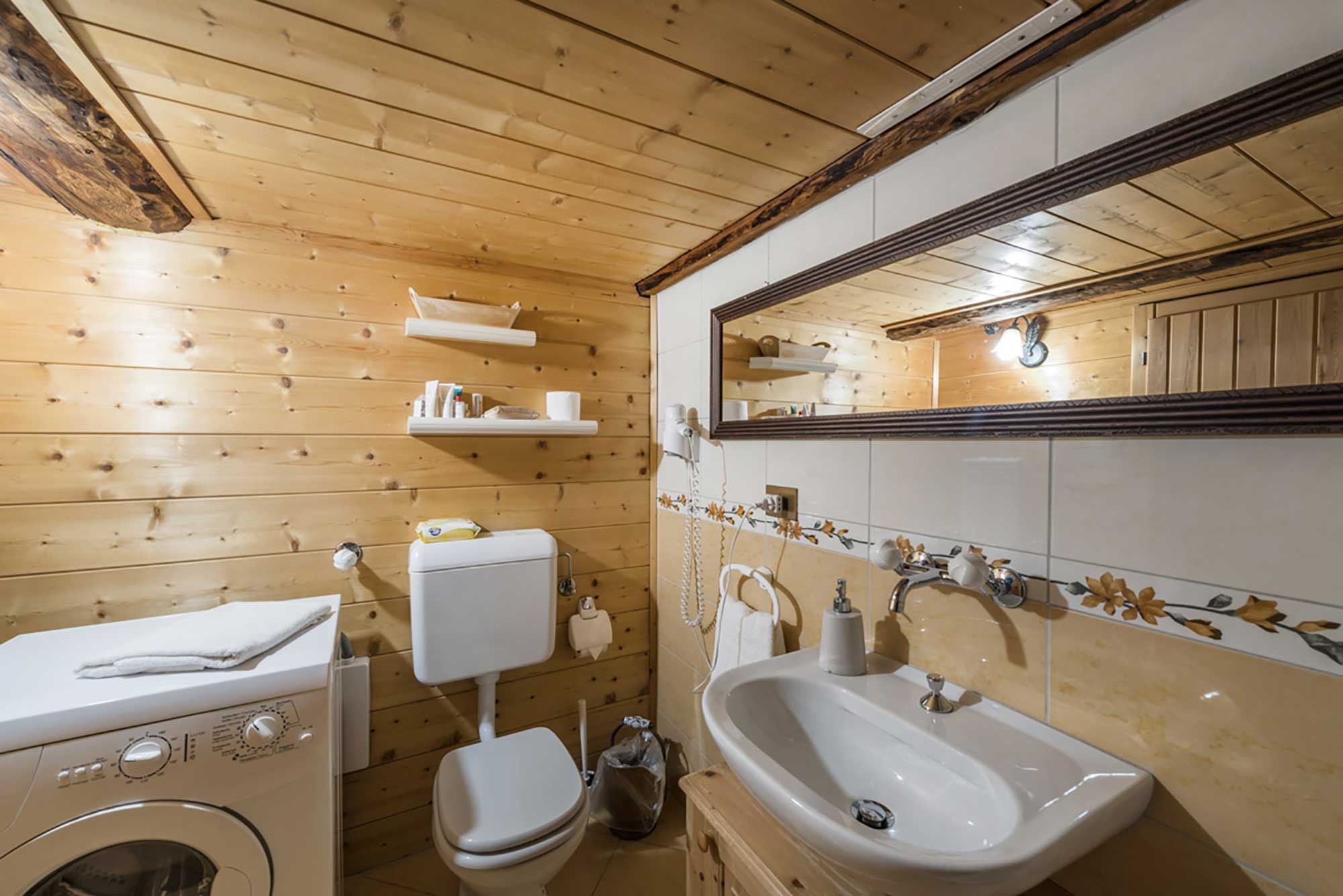 Al piano terreno, con ingresso separato, si accede a un’ampia camera arredata in stile montano, con zona salotto e bagno con doccia. Sempre al piano terreno si trovano la lavanderia e la cantina.